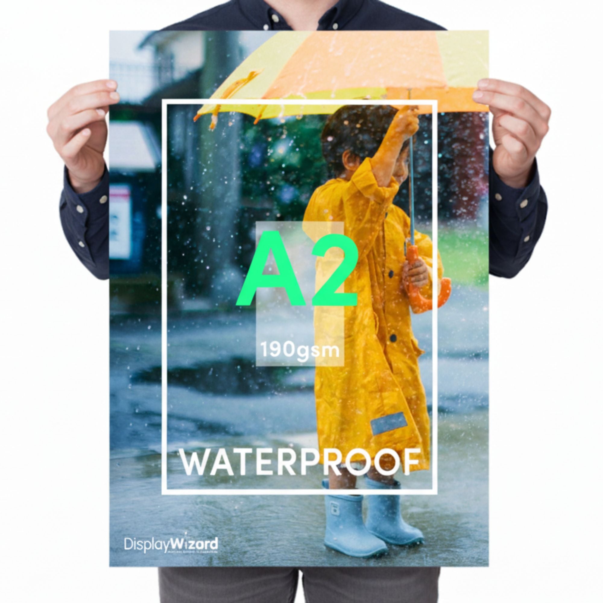 Waterproof A2 Posters – Printed on 190 Micron Matte Polypropylene, these posters have weather-resistant, durable graphics for outdoor or high-traffic locations without sacrificing colour quality. Ideal for forecourts, shop fronts and events.