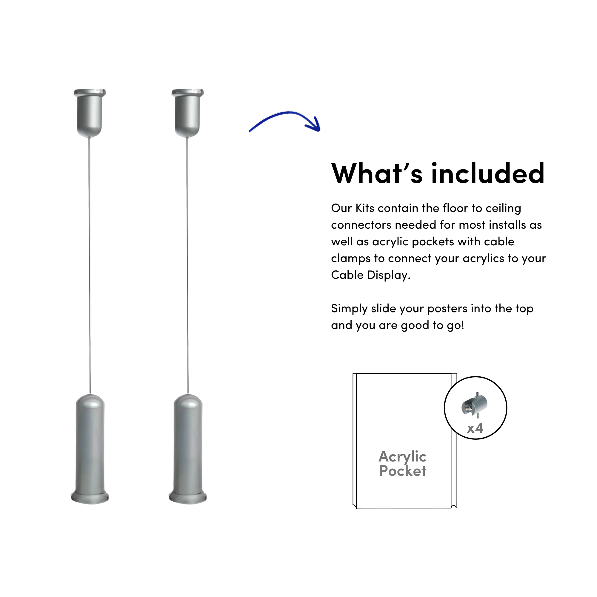 The kit includes acrylic pockets, clamps, and 4m floor to ceiling 1.5mm cables for one vertical row of panels that can be cut to your required length using wire cutters. Screws and plugs are provided to affix the cable to the floor and ceiling.