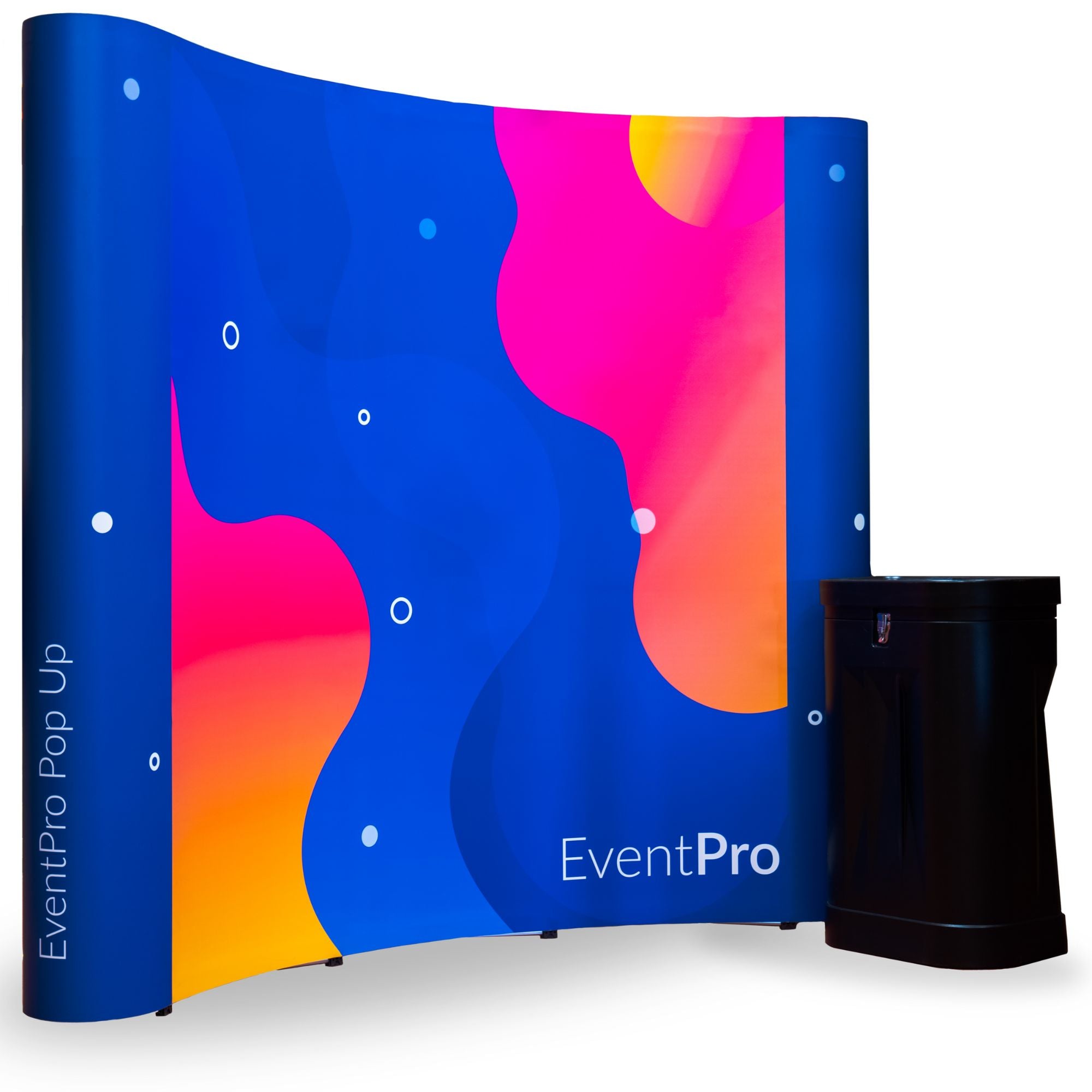 The EventPro 3x3 Curved pop up stand is a portable exhibition stand that can help your branding stand out at a trade show, exhibition or other promotional event. A 3x3 EventPro Curved pop up stand is a great marketing tool for a shell-scheme or space-only exhibiting space, whilst it can also be easily assembled without tools in a matter of minutes.