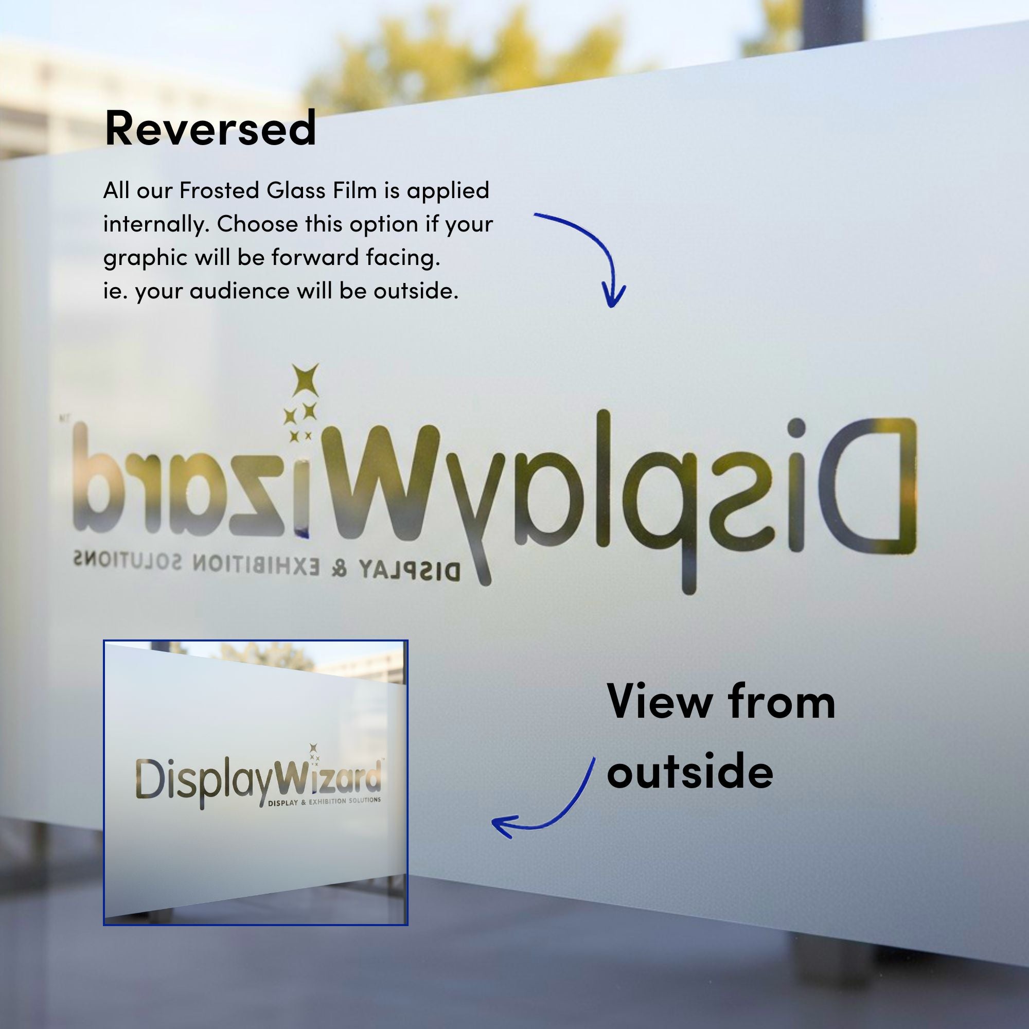 The film is printable for full-colour logos, patterns and wayfinding, and installs wet or dry for a clean, professional finish. Often called silver etch, it’s supplied for internal application. Applied to the inside of the glass to face out. Sometimes referred to as reverse cut/internal fit/wrong reading in artwork setup. Ideal for offices, meeting rooms, receptions and retail window manifestations.