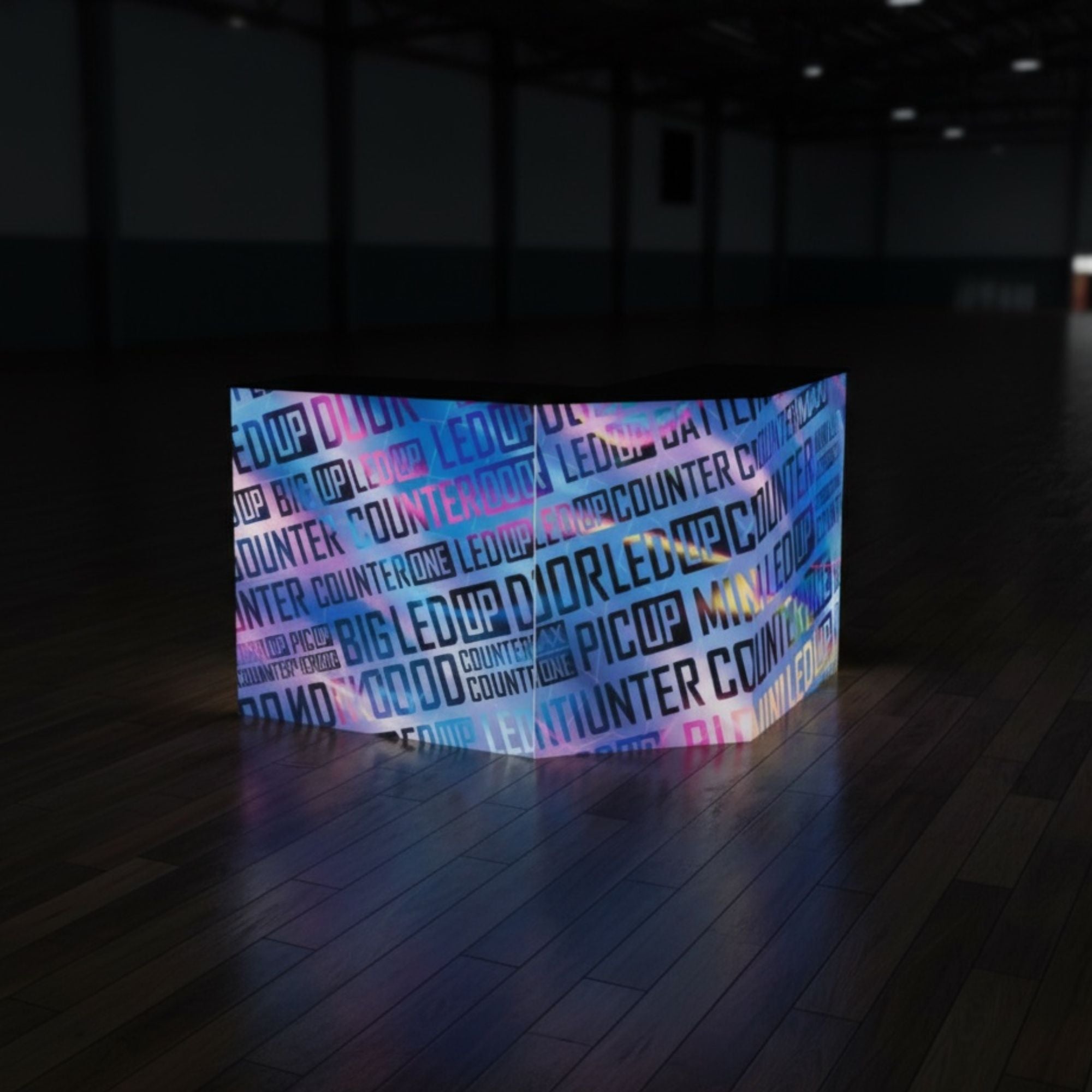 A complete illuminated and Impressive corner display creating a seamless L-shaped counter. Designed with striking LED backlit graphics, this set delivers continuous illumination across all counters, ensuring your brand looks professional and eye-catching at exhibitions, trade shows, product launches, and retail environments.