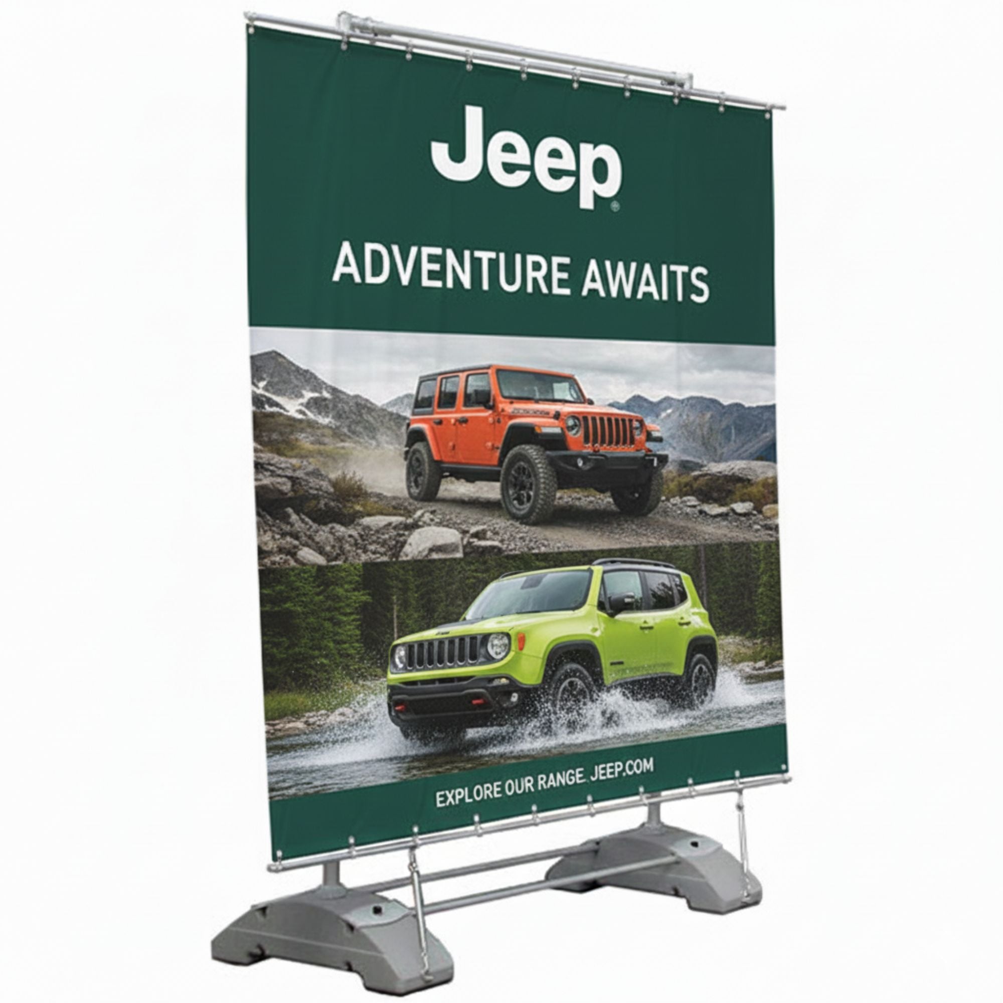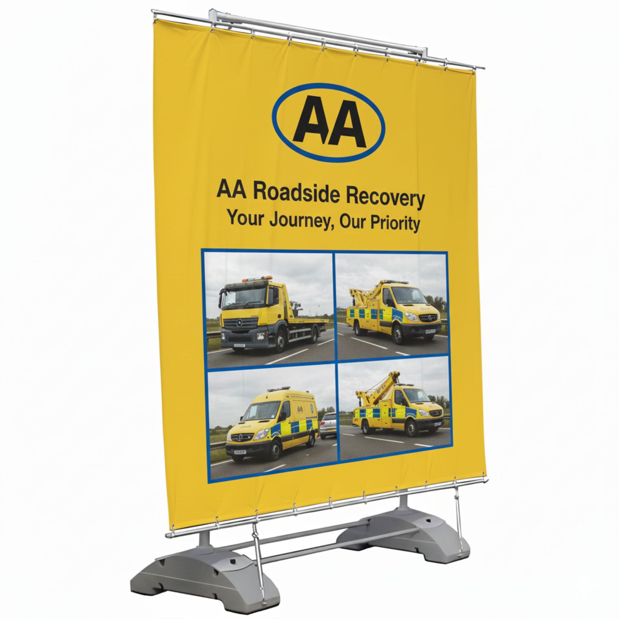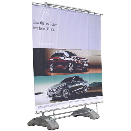 The single or double-sided printed graphics are either 440GSM Banner Vinyl, or 210 GSM Display Polyester. All print materials are B1 fire rated and are designed for outdoor use. Banner Vinyl is not recommended for excessively windy areas. Fabric can be utilised for a more eye-catching display.