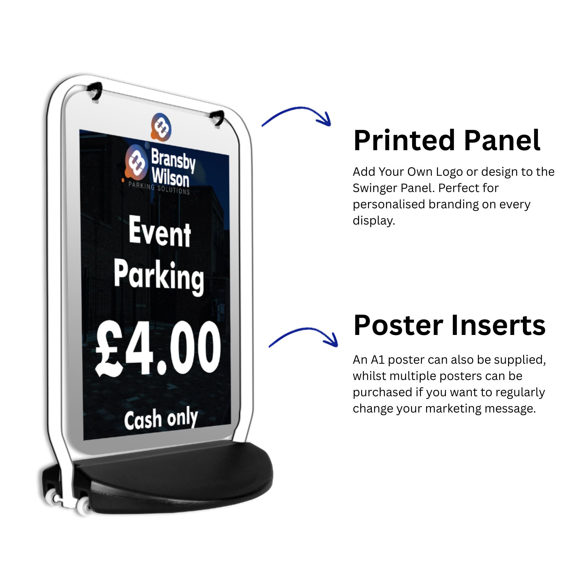 The Swinger 4000 Poster Swing Sign is a double-sided A1 poster display with a top-opening poster pocket and secure magnetic seals.